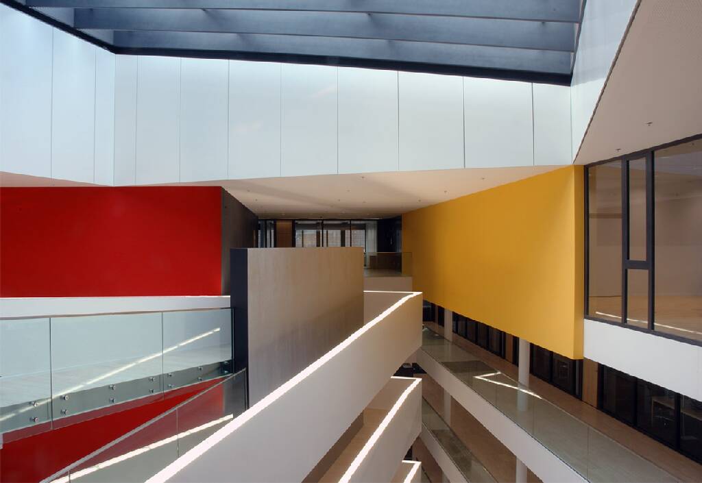 Die farbliche Grundgestaltung ist in dezentem anthrazit-metallic und weiss gehalten. Ausge-wählte Bauelemente im Innenhof wurden in den Farben rot, blau, gelb und grün konzipiert und