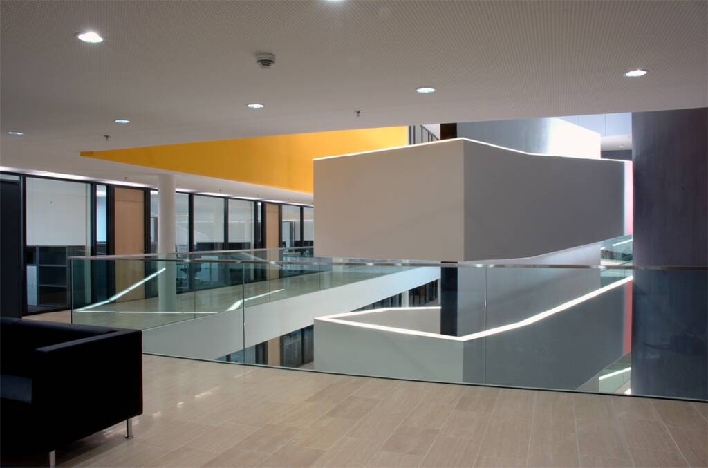 vermitteln ein besonderes Ambiente. Die laubengangartige Erschliessung der Büros wird durch elegante Glaswände zum Korridor hin abgegrenzt und vermittelt die gewünschte Transparenz. Zur Förderung der Kommunikation wurden in den Laubengängen verschiedene Pausenzonen, Servicestationen und die allgemeine Ablage integriert.